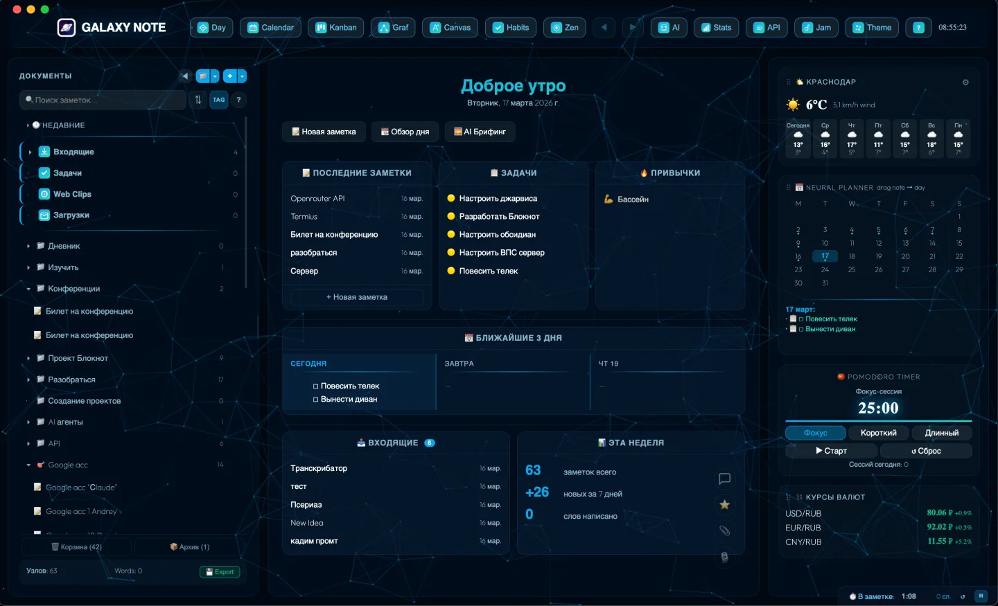 Galaxy Note сочетает заметки, AI, Kanban, Canvas, граф знаний и шифрование — за 499 ₽/мес вместо $12. Плюс работает офлайн и не читает ваши данные. Galaxy Note combines notes, AI, Kanban, Canvas, knowledge graph, and encryption — for 499 ₽/mo instead of $12. Plus it works offline and never reads your data.